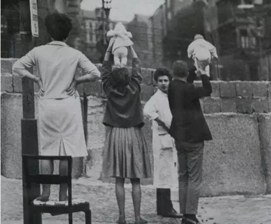 住在民主德国(东德)的儿子、儿媳将小孩子递过去看望住在联邦德国(西德)的祖父母,其实他们之间只隔一道柏林墙而已。