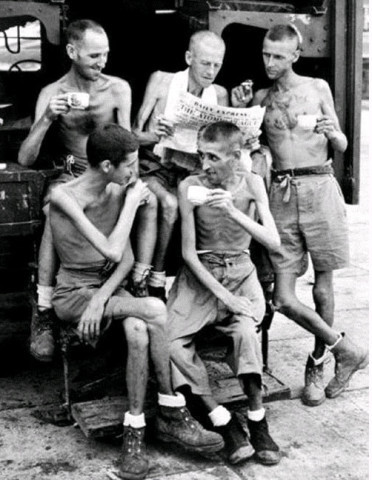 5名被日本囚禁在新加坡的澳大利亚战俘。原本身体魁梧的澳洲军人竟被折磨的骨瘦如柴了。