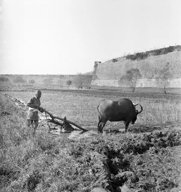 1940年代,南京,城墙外农夫用水牛犁地。海达·莫里循/摄。