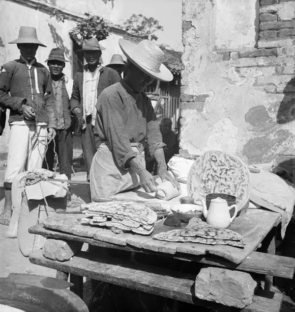 民国时期,南京,街上做葱油大饼的摊贩。海达·莫里循/摄。