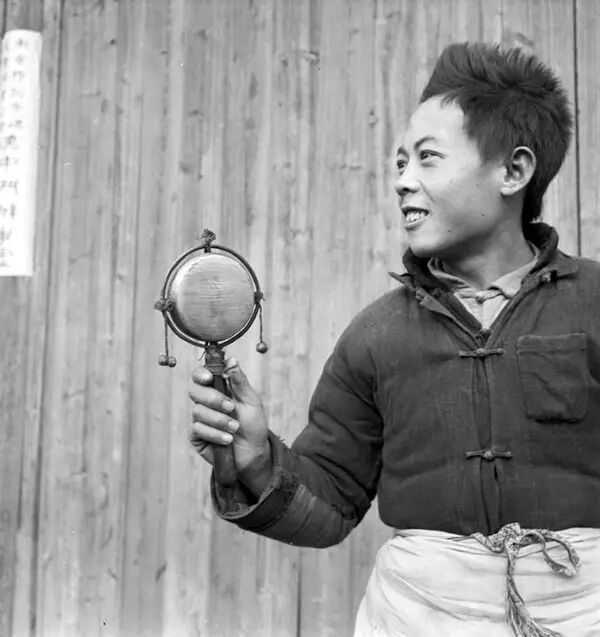 1940年代,南京,摇鼓招揽顾客,这位摊贩是做混沌生意的。海达·莫里循/摄。