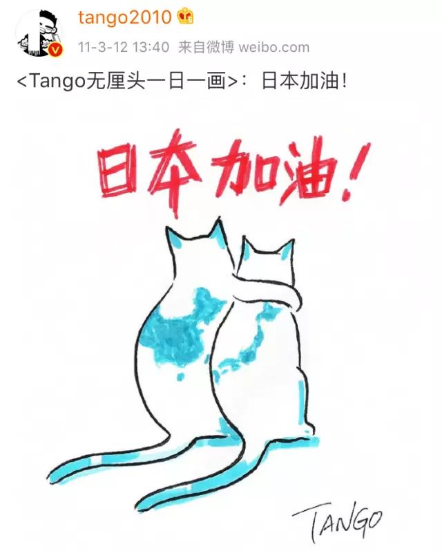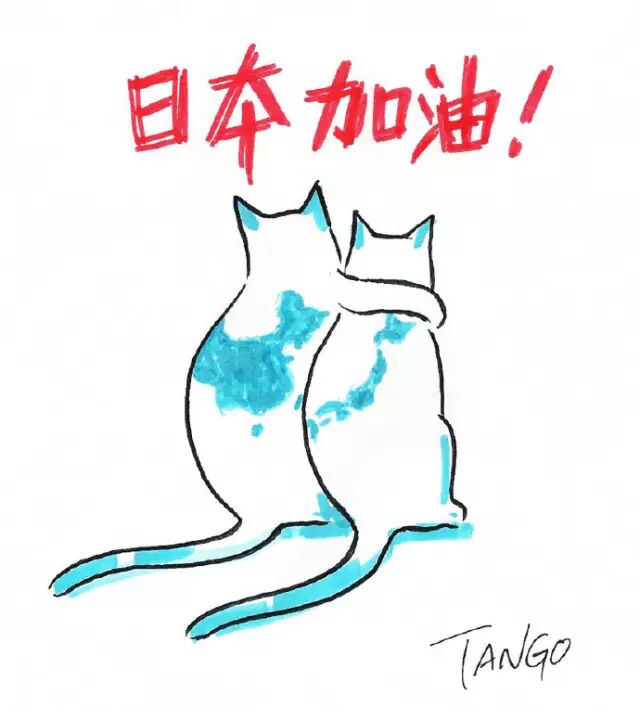 2011年日本“3·11”大地震,他画了一幅“日本加油!”,画中两只猫相拥而立,一只是日本,一只是中国。