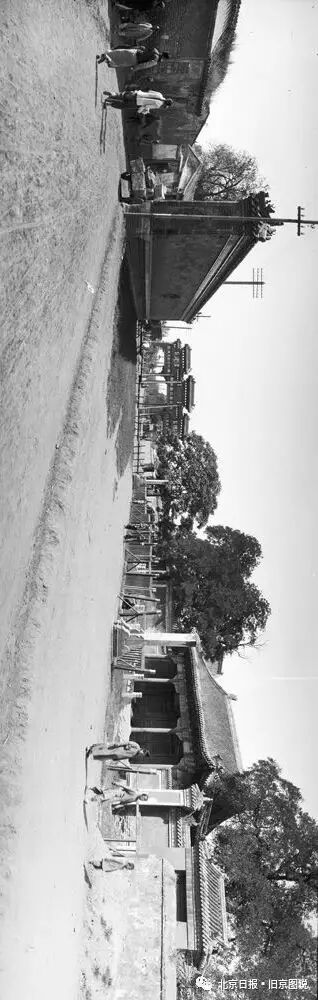平民百姓严禁从帝王庙前面的正道通过,只能从阜内大街路南边大影壁后的两座葫芦形门绕道走,所以北京童谣里有“帝王庙,绕葫芦”的歌词。图为1900年代的历代帝王庙山门,可以看见行人从大影壁后面绕行。远处是“景德街”西牌楼和妙应寺白塔。