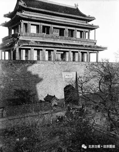 1917年,从瓮城内拍摄的阜成门城楼。阜成门元代叫平则门,京西门头沟的煤车多从此门出入。因“梅”与“煤”谐音,故煤栈客商在瓮城门洞内募捐雕了一束梅花。西德尼·甘博摄
