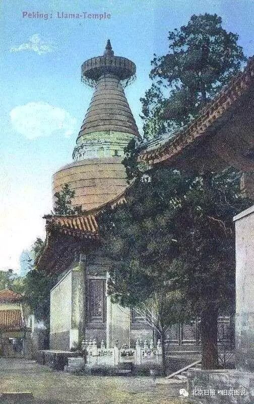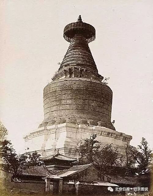 阜内大街上最著名的一处古迹是妙应寺,俗称白塔寺。它是一座藏传佛教格鲁派寺院,寺内的白塔建于元朝,是中国现存年代最早、规模最大的喇嘛塔。图为1946年的妙应寺白塔。 赫达·莫里循摄