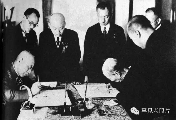 同日,关东军司令官武藤信义(左)与“满洲国”国务总理郑孝胥(右)签订《日满议定书》,中国东北成为日本的殖民地。