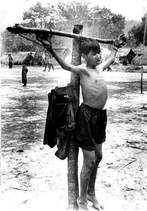 1979年一个柬埔寨男孩因为偷食物被抓,捆绑的姿势使得他必须垫着脚站着,他还算幸运,只被绑一天。还有许多人会被长期捆绑直至死去。