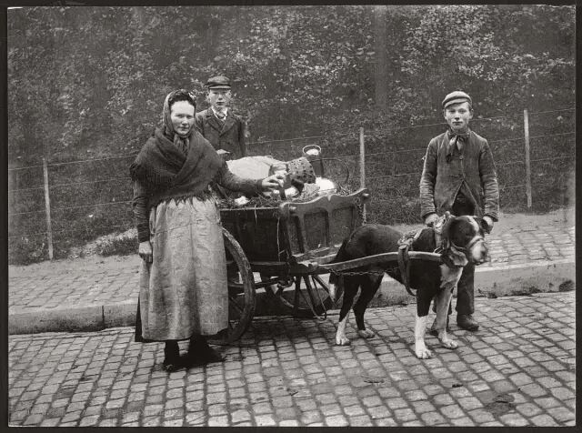 1990年代,比利时布鲁塞尔的卖奶人会使用狗来拉车。