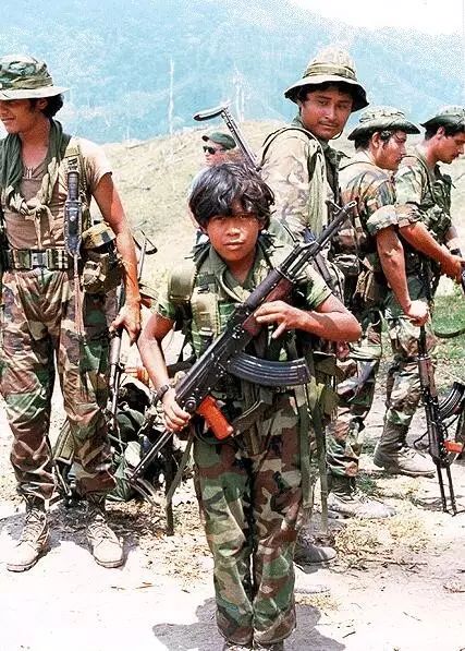 1984年,尼加拉瓜山区某处,一个拿着枪的娃娃兵。1978~1990年尼加拉瓜革命期间,有五万人丧生。