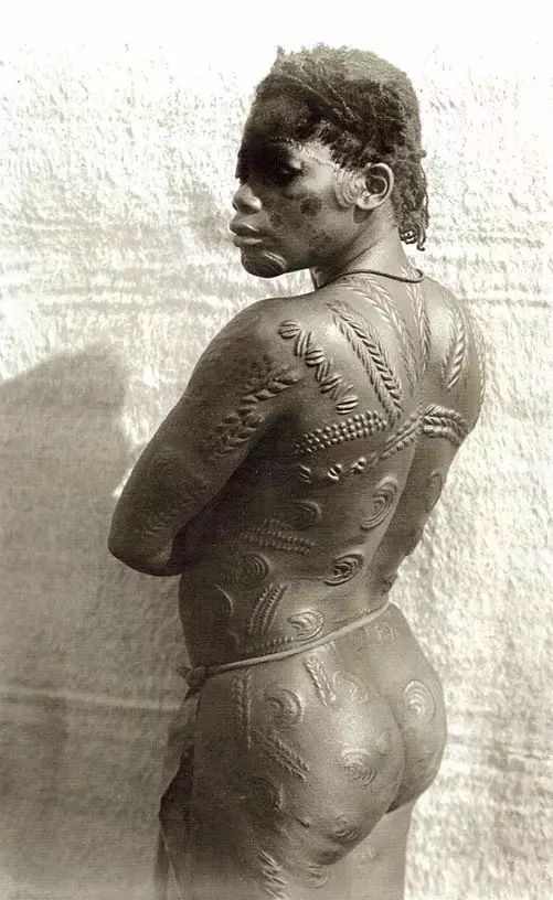 一名比利时刚果(现扎伊尔)女子在1920年展示“美丽伤痕”。一些部落用这些疤痕来增加女人的魅力。