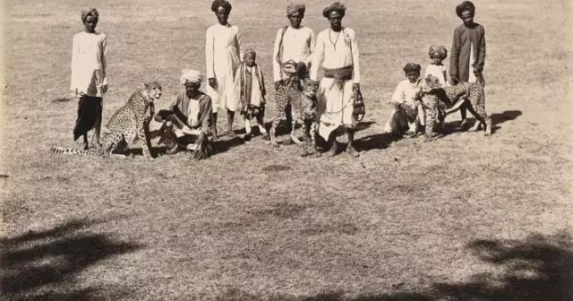 1895年印度某处,猎人们和他们的宠物猎豹。