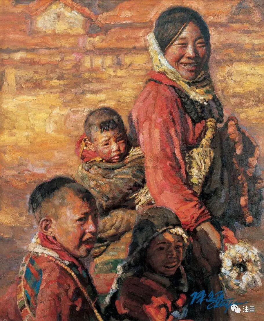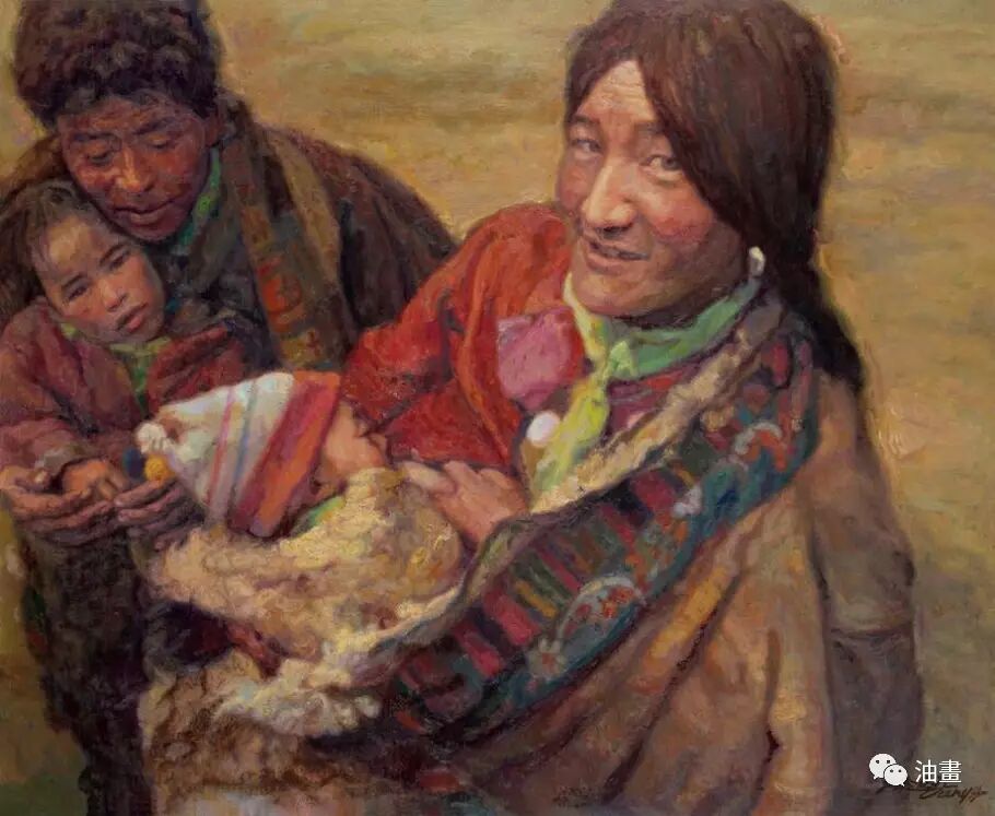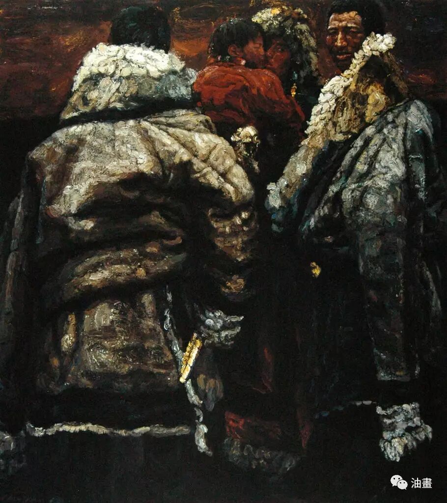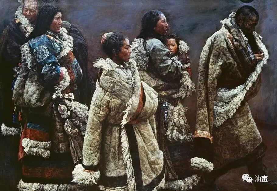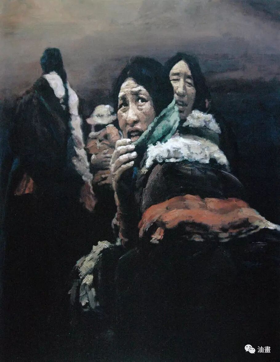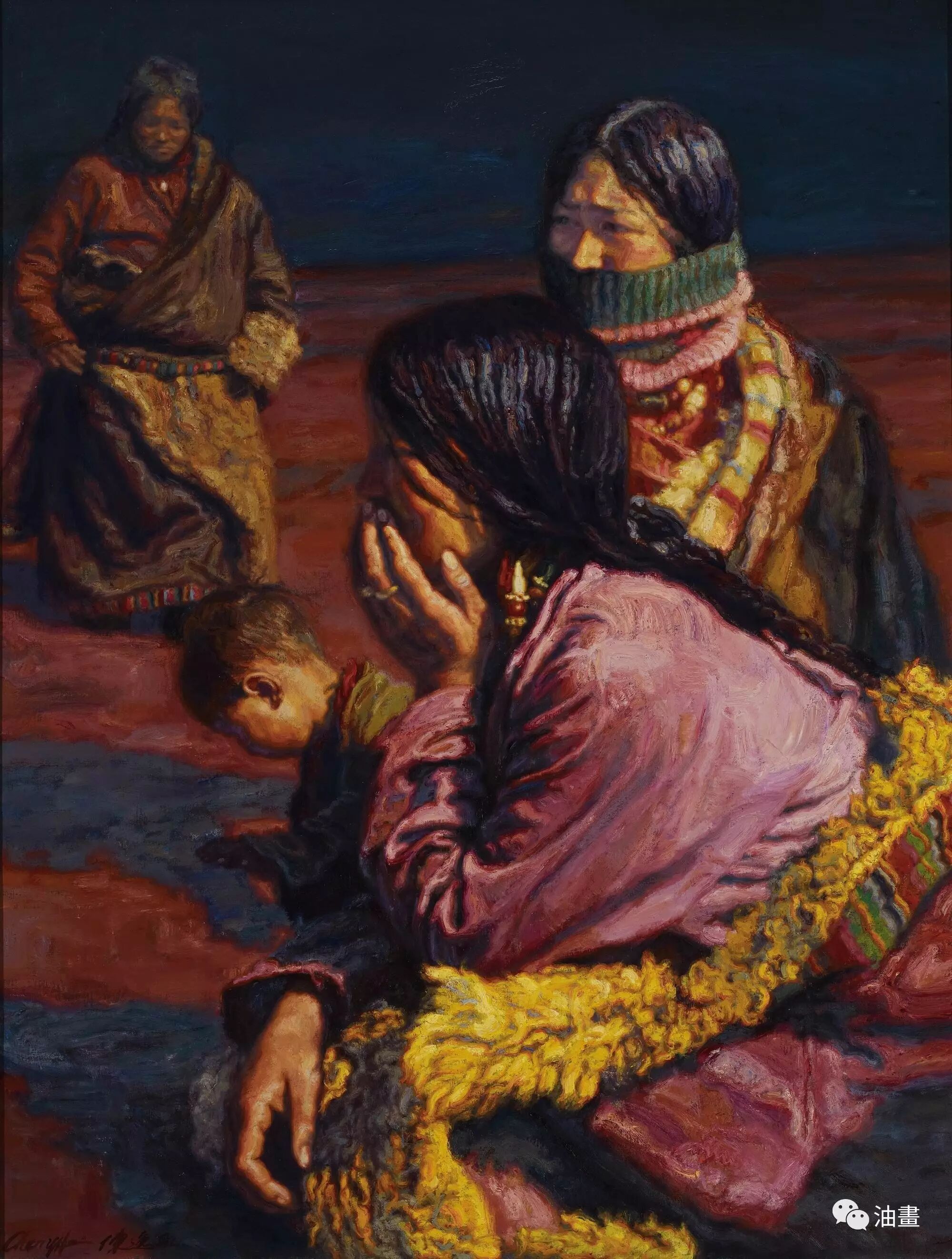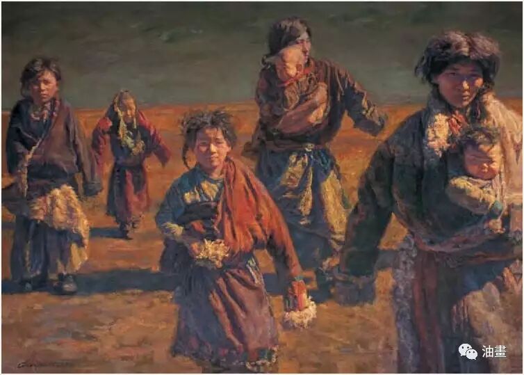 陈逸飞创作了一系列以西藏民俗为主题的油画,刻意凸显藏民的粗犷、原始、神秘。用奇异的民俗去演绎古老中国的浪漫故事以唤起西方对东方的无限想象。看他的《晨曦》( 1995)、《山地风》( 1994)、《藏族人家》( 1995)、《山人(1996)、《神庙》( 1995) 等。