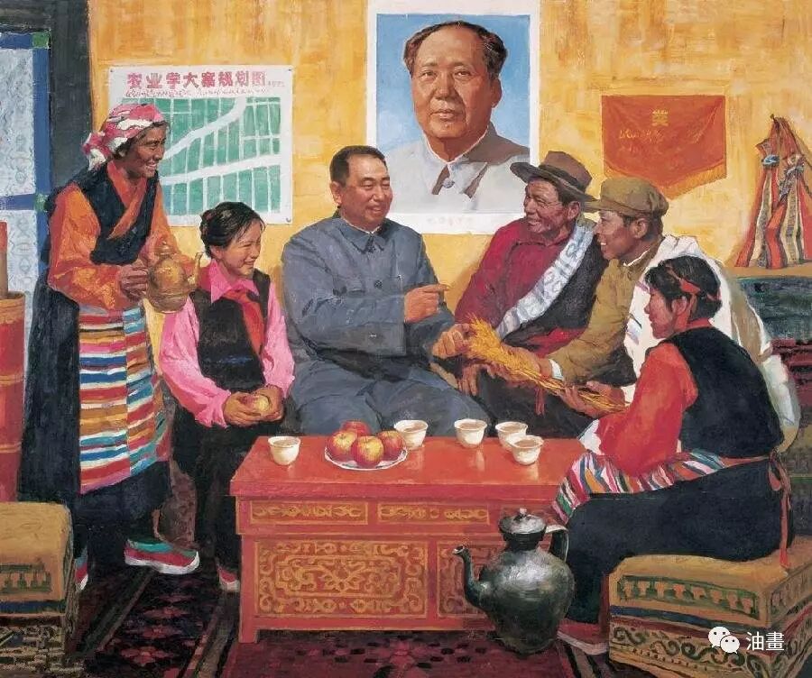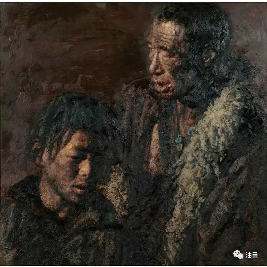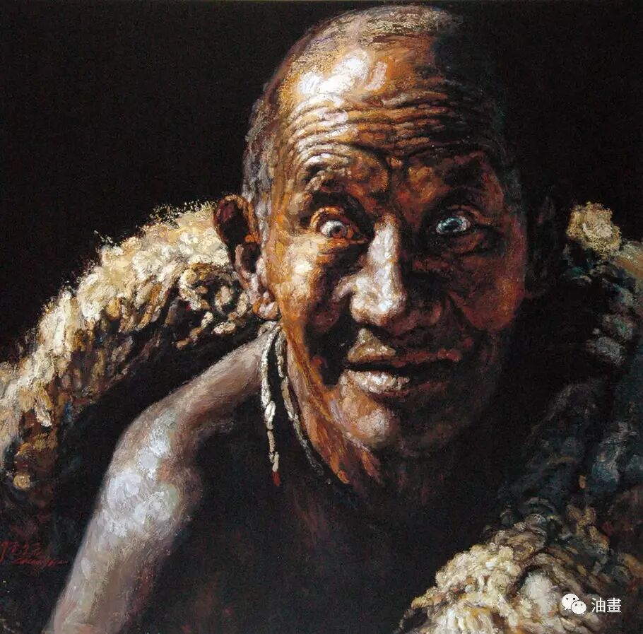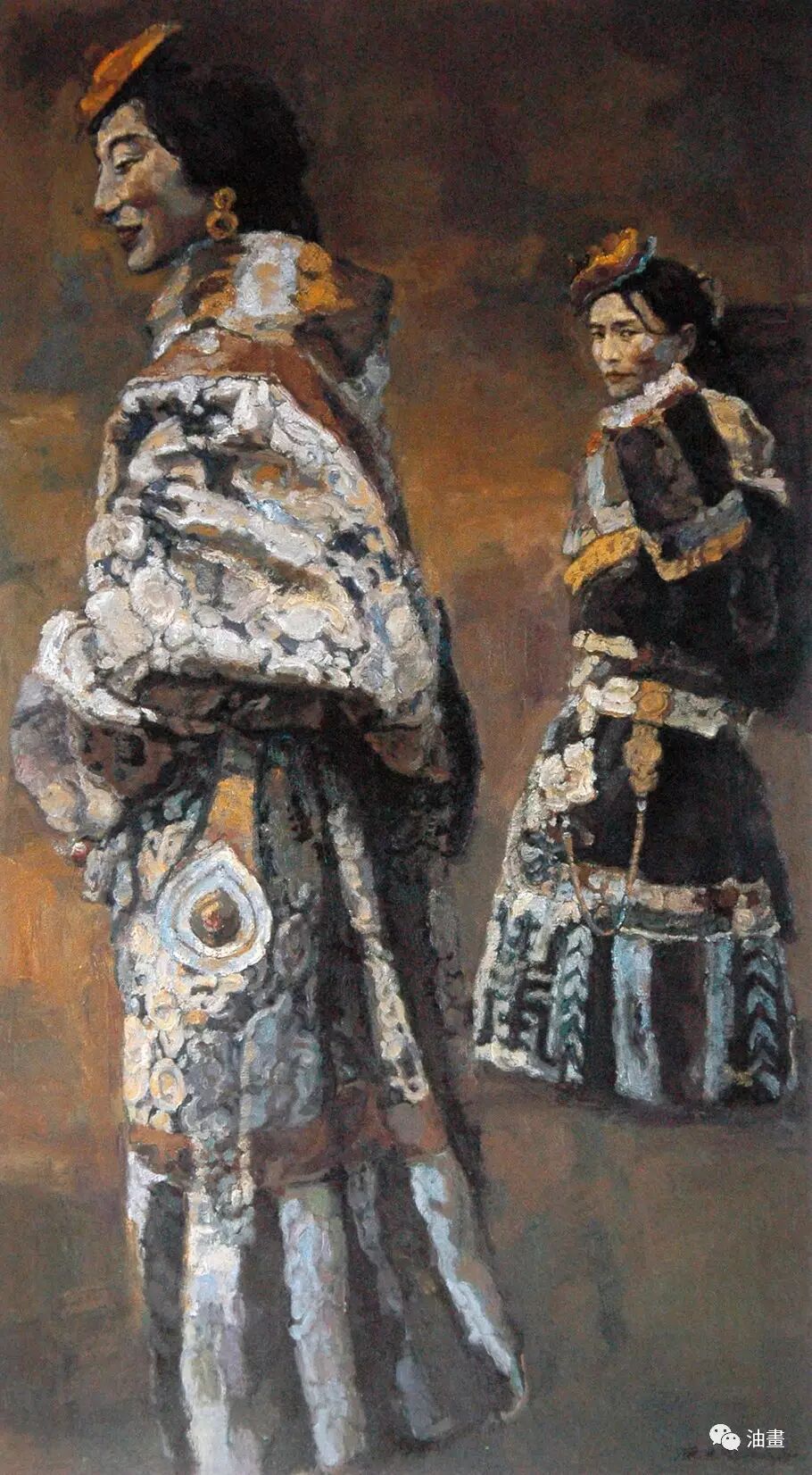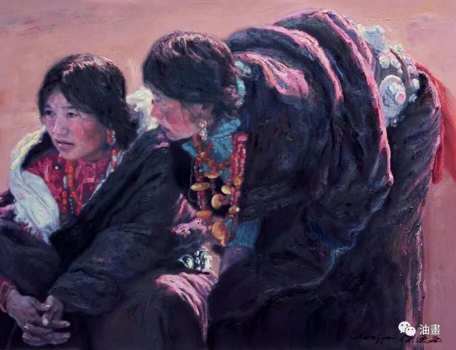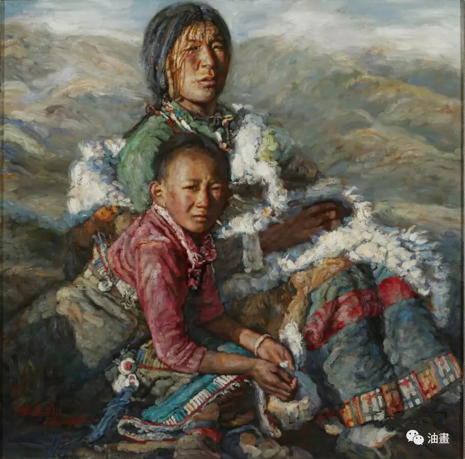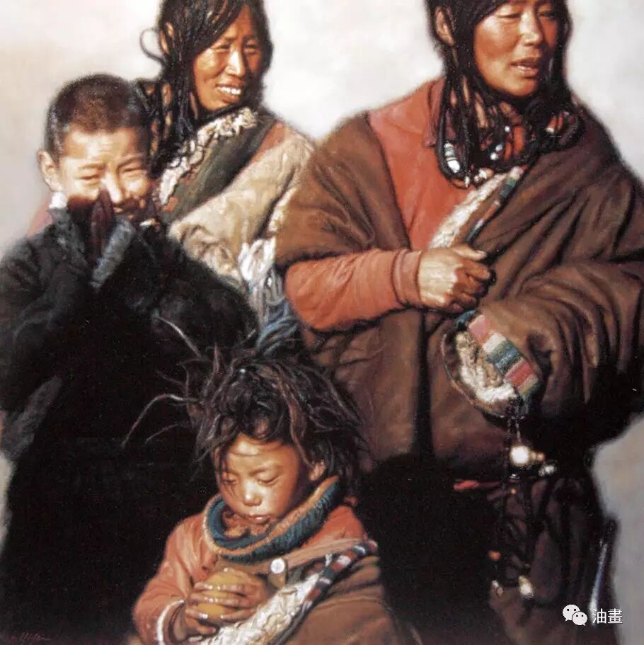陈逸飞创作了一系列以西藏民俗为主题的油画,刻意凸显藏民的粗犷、原始、神秘。用奇异的民俗去演绎古老中国的浪漫故事以唤起西方对东方的无限想象。看他的《晨曦》( 1995)、《山地风》( 1994)、《藏族人家》( 1995)、《山人(1996)、《神庙》( 1995) 等。