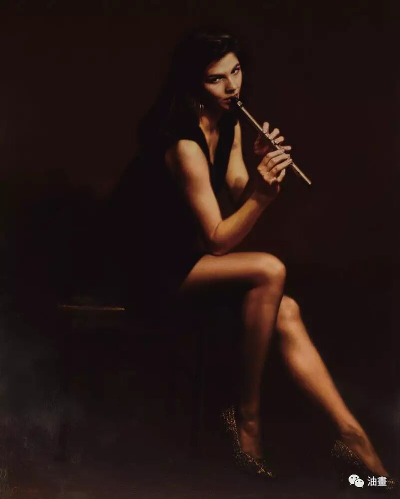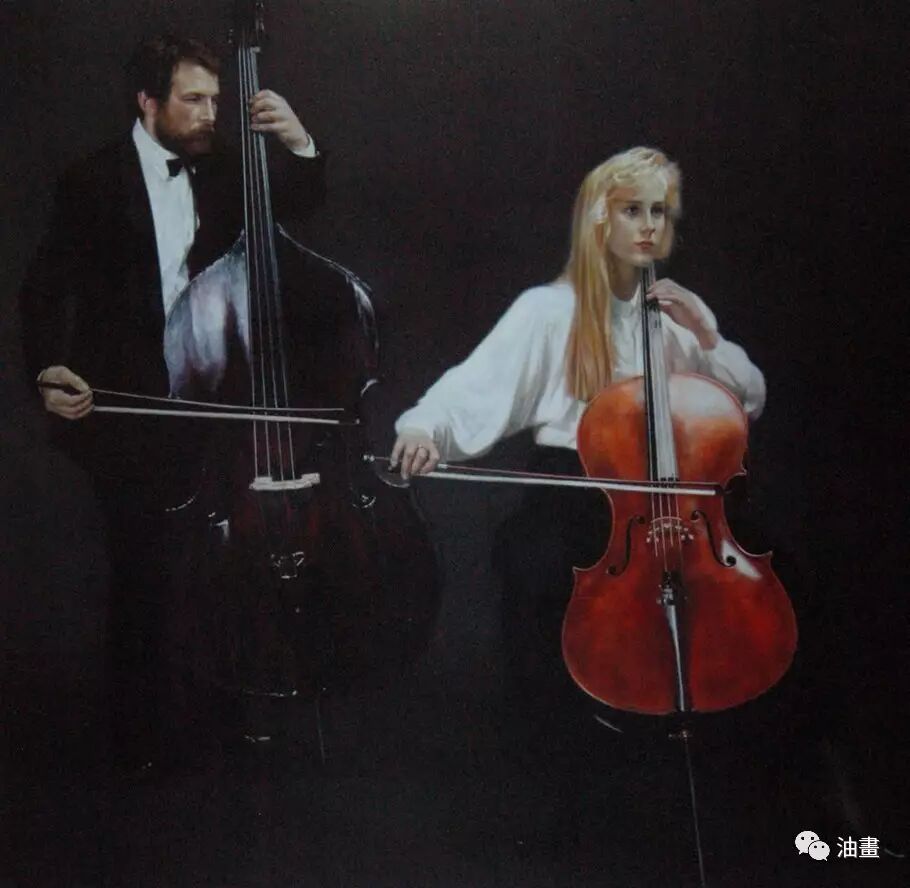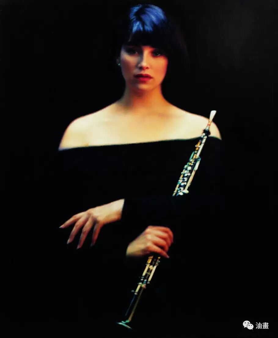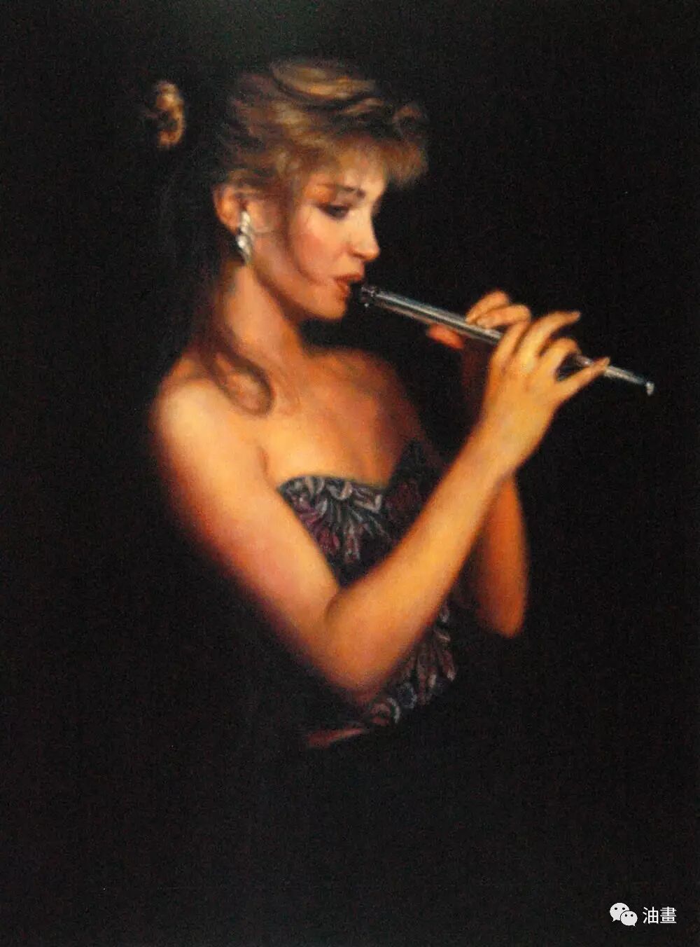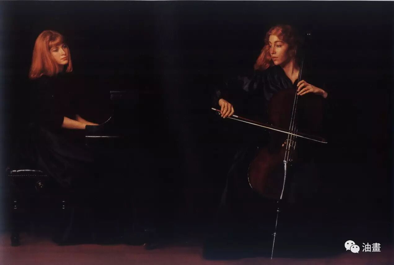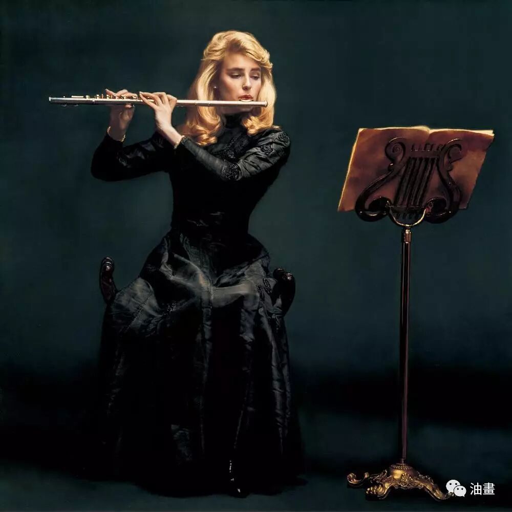 他有一组作品是音乐题材的肖像:《大提琴手》(1983,现哈默收藏)、《钢琴手》(1984)、《中提琴手》(1988)、《长笛手》( 1987)。画家把自己所画的人物置于空旷背景上的雕塑,其造型力度异常扎实、完美,技巧近乎炉火纯青。他采用美国照相写实主义的技法描摹的现代、高贵、优雅的西方美人画面形成音乐家、乐器和乐曲之间微妙的呼应关系。画面有旋律感,构图及人物处理有现代感,背景大胆启用黑色,给人无穷的想象。