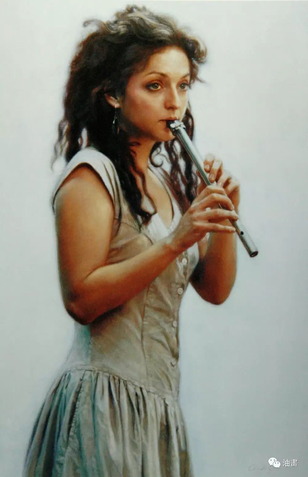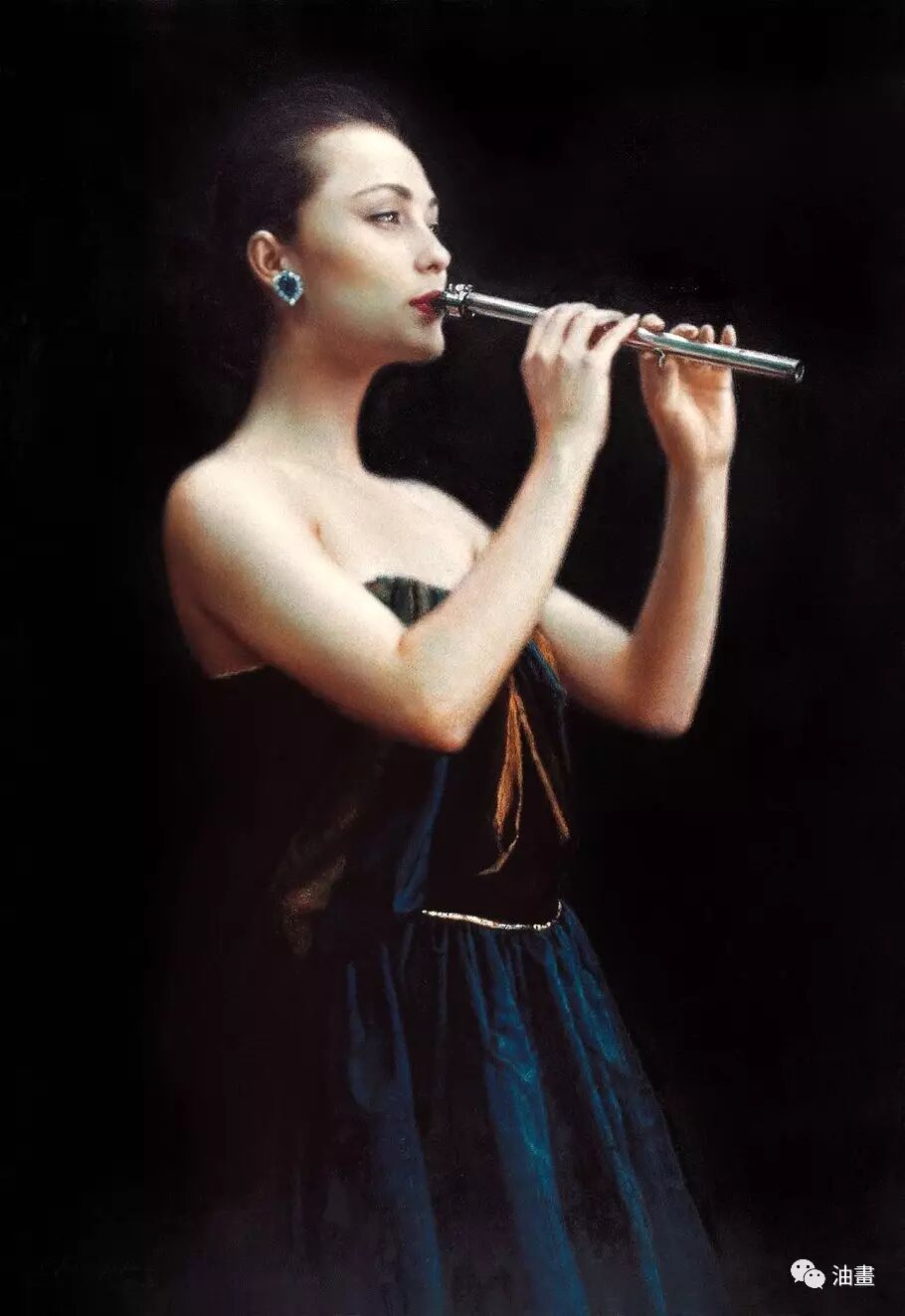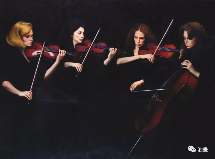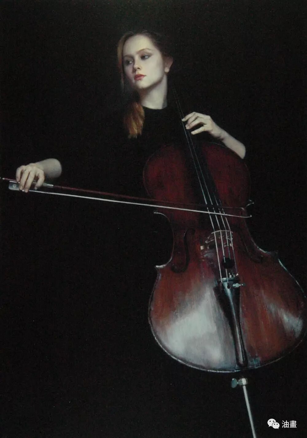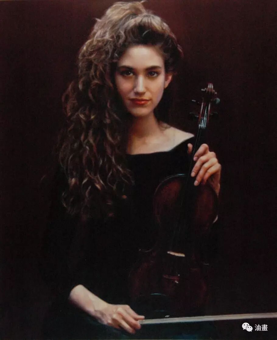 他有一组作品是音乐题材的肖像:《大提琴手》(1983,现哈默收藏)、《钢琴手》(1984)、《中提琴手》(1988)、《长笛手》( 1987)。画家把自己所画的人物置于空旷背景上的雕塑,其造型力度异常扎实、完美,技巧近乎炉火纯青。他采用美国照相写实主义的技法描摹的现代、高贵、优雅的西方美人画面形成音乐家、乐器和乐曲之间微妙的呼应关系。画面有旋律感,构图及人物处理有现代感,背景大胆启用黑色,给人无穷的想象。