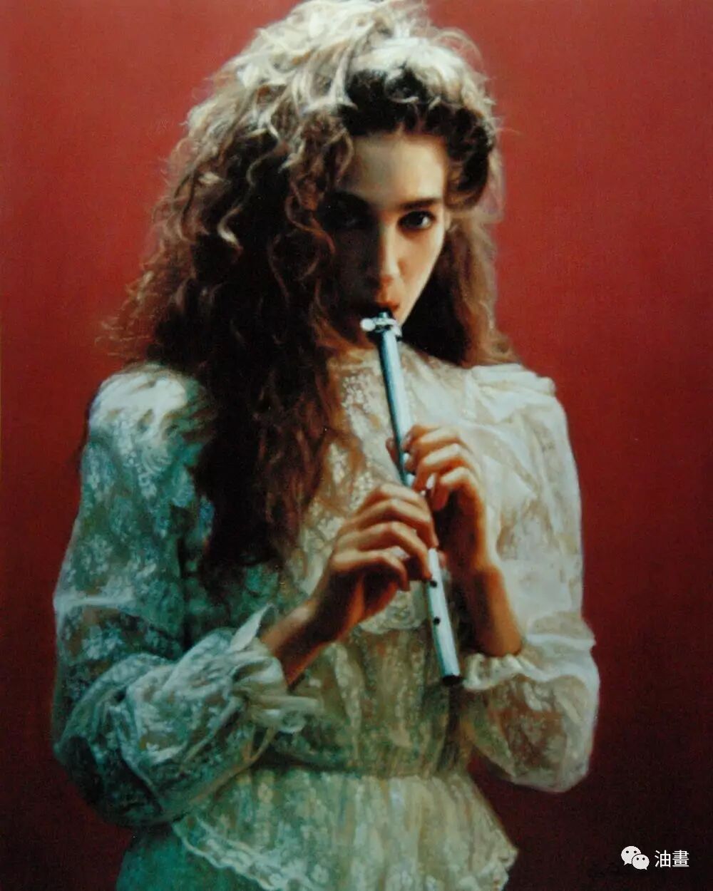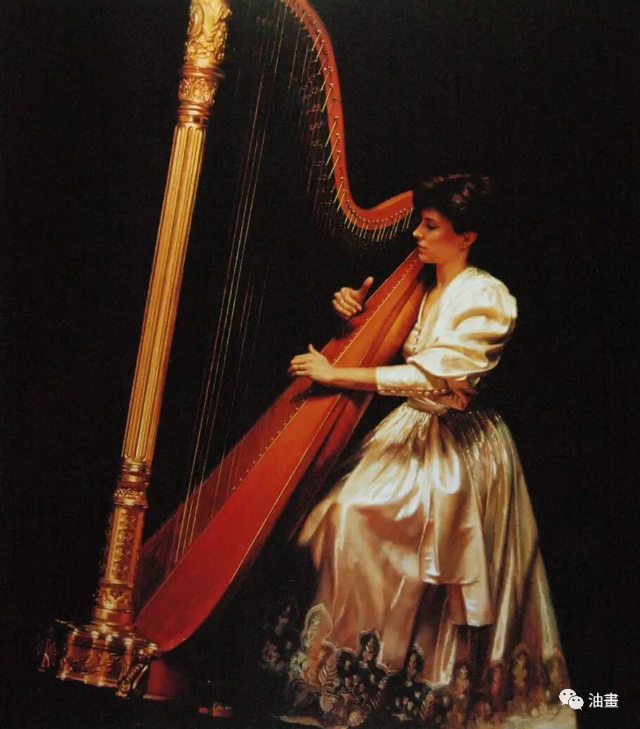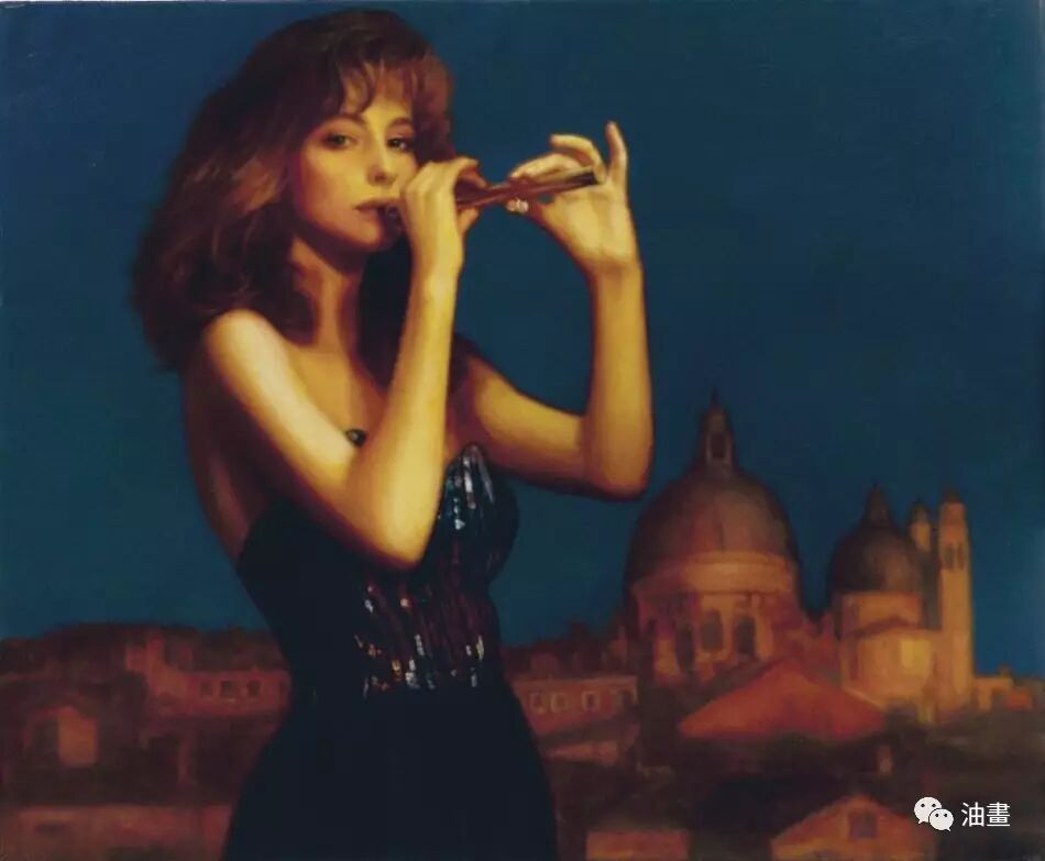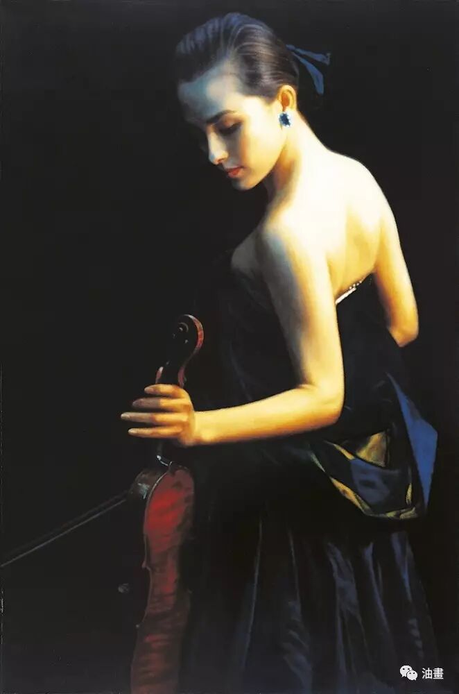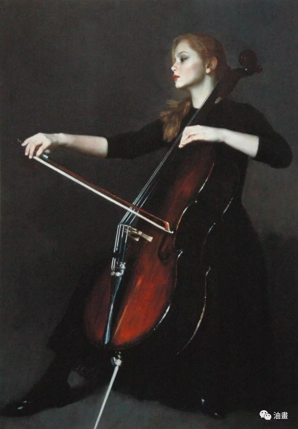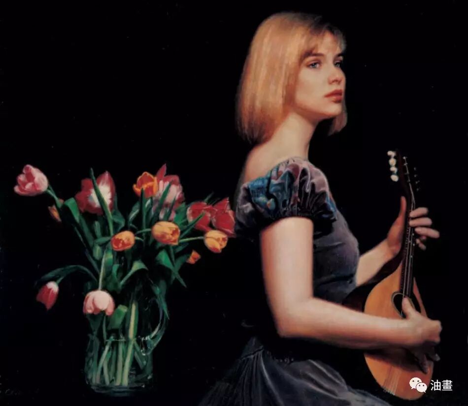 他有一组作品是音乐题材的肖像:《大提琴手》(1983,现哈默收藏)、《钢琴手》(1984)、《中提琴手》(1988)、《长笛手》( 1987)。画家把自己所画的人物置于空旷背景上的雕塑,其造型力度异常扎实、完美,技巧近乎炉火纯青。他采用美国照相写实主义的技法描摹的现代、高贵、优雅的西方美人画面形成音乐家、乐器和乐曲之间微妙的呼应关系。画面有旋律感,构图及人物处理有现代感,背景大胆启用黑色,给人无穷的想象。