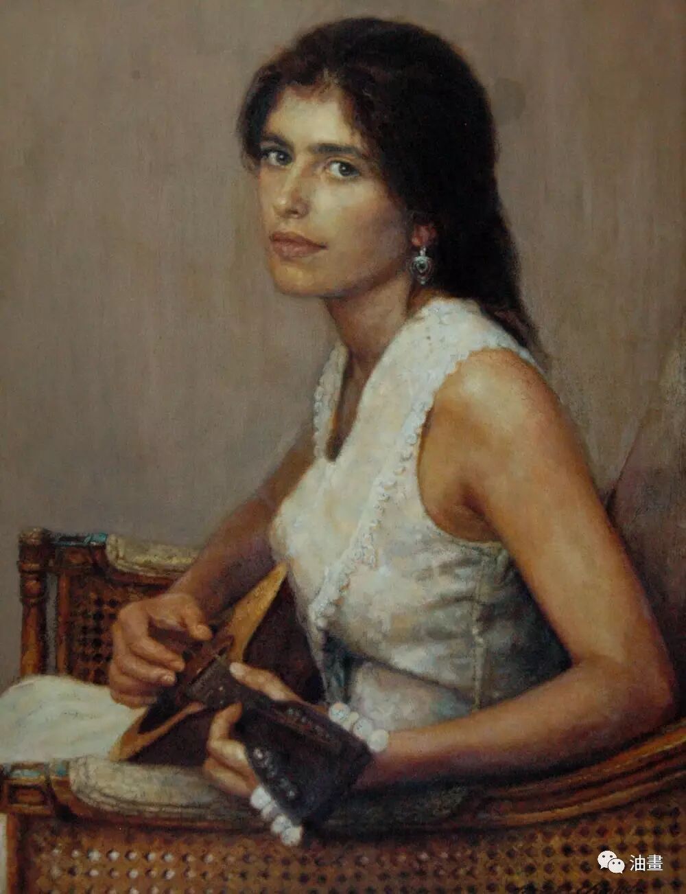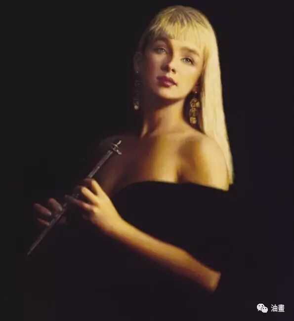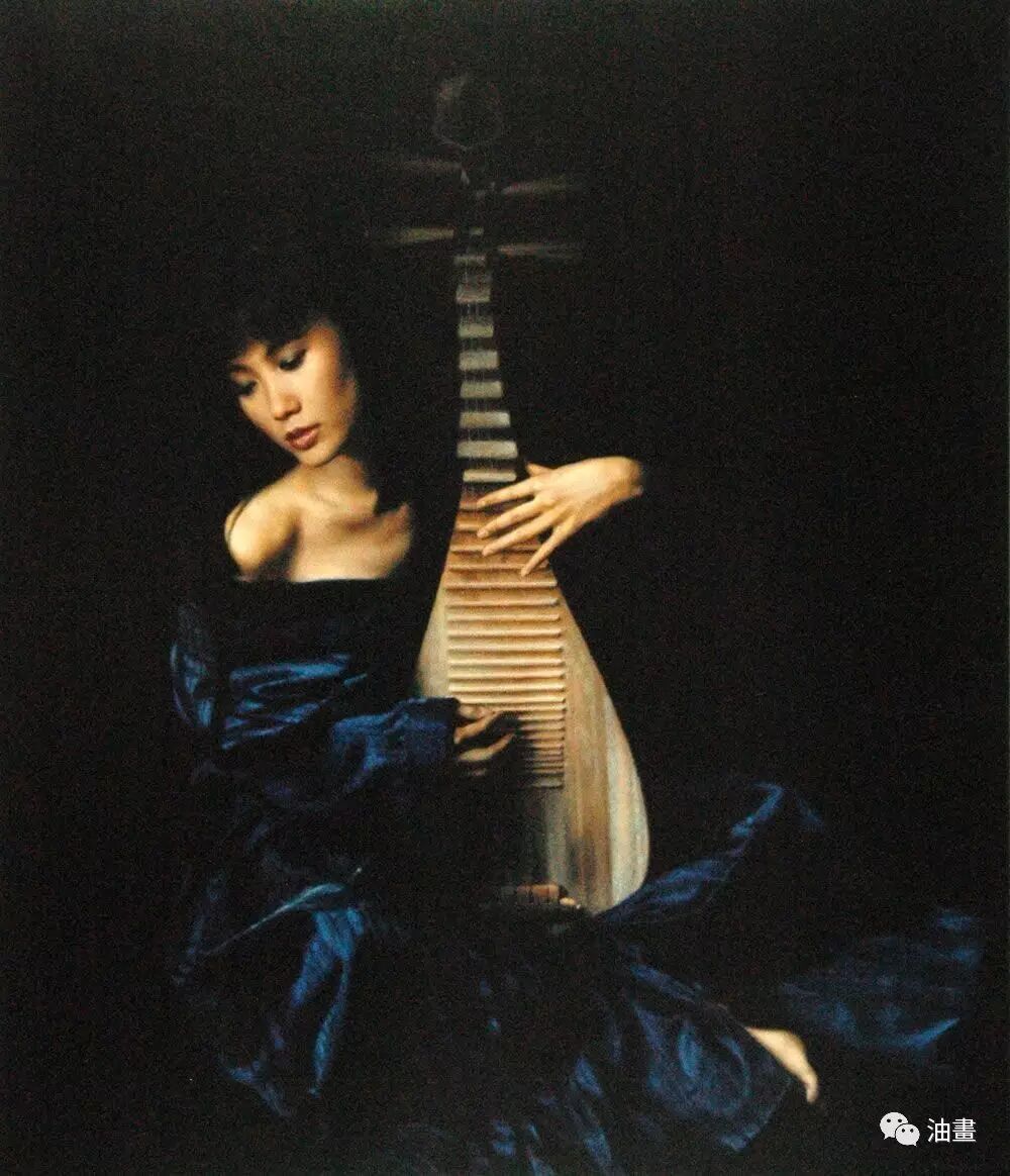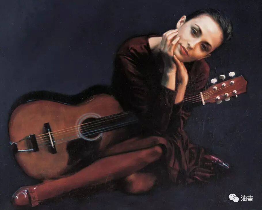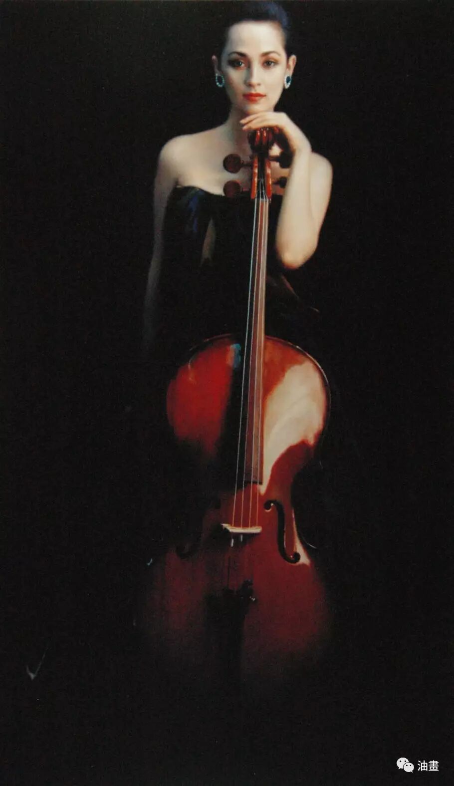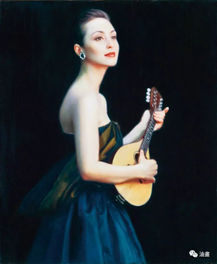 他有一组作品是音乐题材的肖像:《大提琴手》(1983,现哈默收藏)、《钢琴手》(1984)、《中提琴手》(1988)、《长笛手》( 1987)。画家把自己所画的人物置于空旷背景上的雕塑,其造型力度异常扎实、完美,技巧近乎炉火纯青。他采用美国照相写实主义的技法描摹的现代、高贵、优雅的西方美人画面形成音乐家、乐器和乐曲之间微妙的呼应关系。画面有旋律感,构图及人物处理有现代感,背景大胆启用黑色,给人无穷的想象。