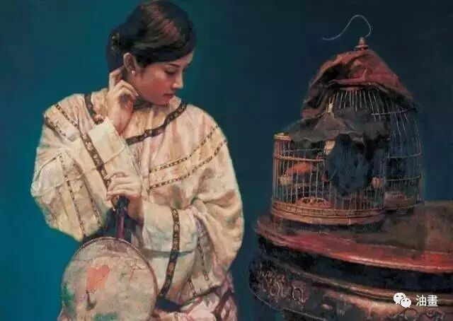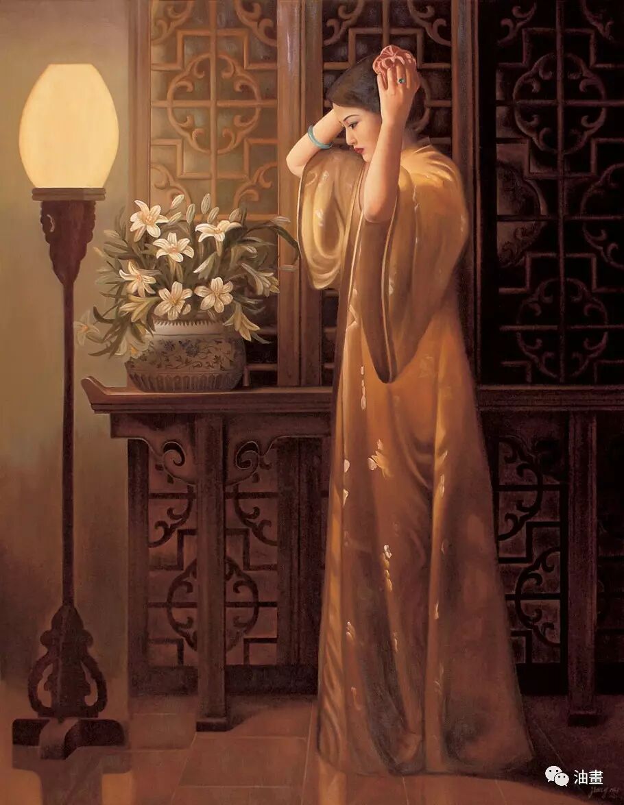 90 年代初,陈逸飞将西方古典写实画风推向极致,丝丝入扣地遵循着精致、细腻的完美准则,用炉火纯青的西方技法将他的东方美人刻画得近乎“唯美”,并带有浓厚的脂粉味,而其作品命名也大多出自中国古典诗词中的典雅意象。