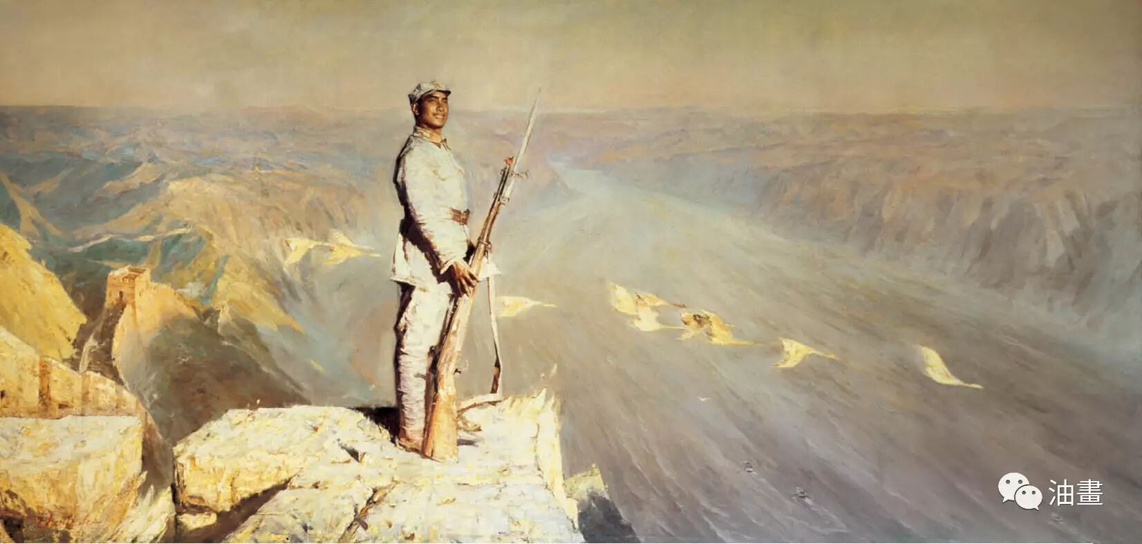 此作画面上是一位持枪挺立的威武雄壮的战士,配以苍莽的河山和低飞的群雁作背景,完满地构成了一个诗意葱茏的壮阔的艺术境界。