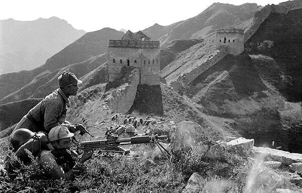 1938年春,河北涞源县浮图峪长城,八路军战士战斗在古长城。沙飞/摄。
