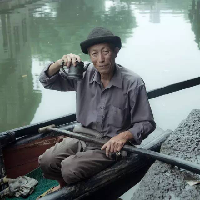 负责摇乌篷船招待游客的老王,年已七十,休息时会在河边喝碗黄酒。