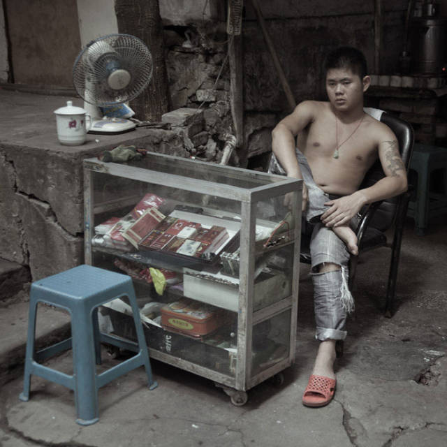 臂上纹龙的年轻老板,百无聊赖地看守他的小烟摊。