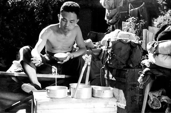 1952年,徐肖冰在朝鲜前线就餐时留影。