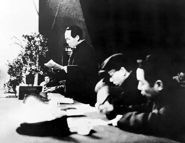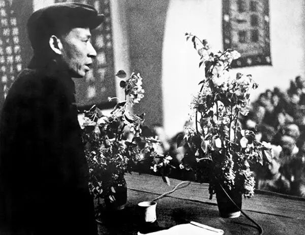 1945年,中共七大上,刘少奇作《关于修改党章的报告》。徐肖冰/摄。
