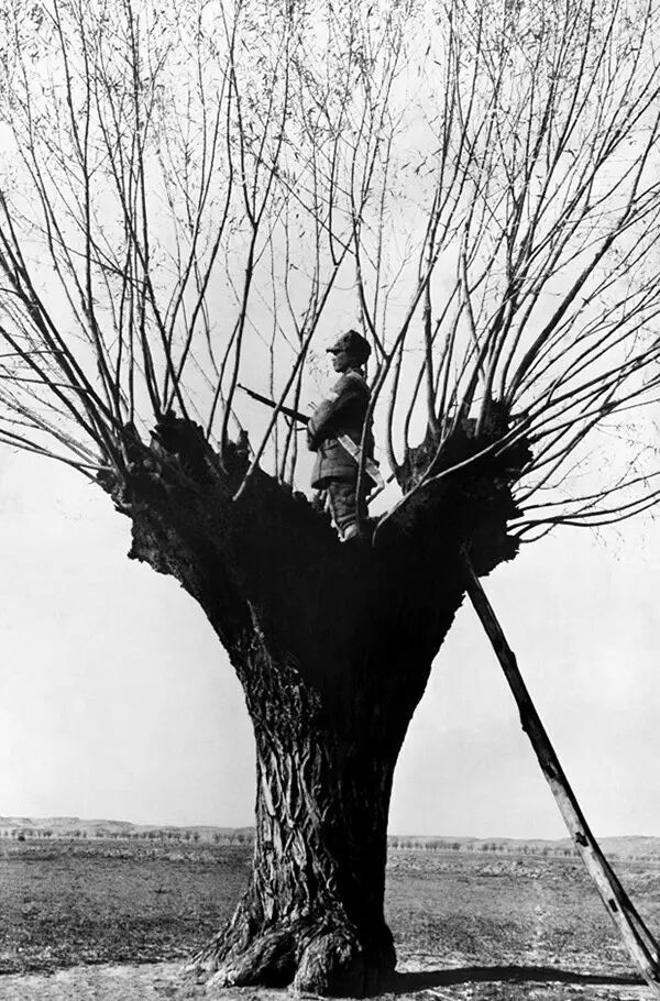 1940年,陕甘宁边区,在大树上放哨的士兵。徐肖冰/摄。