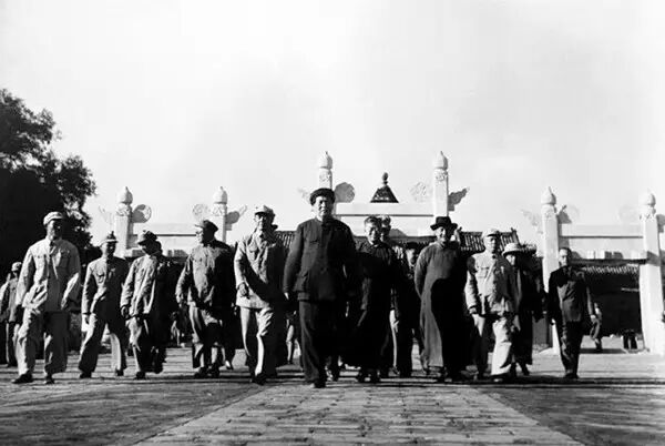 1949年9月19日,毛泽东陪同张元济、程潜、陈明仁等民主人士同游天坛。徐肖冰/摄。