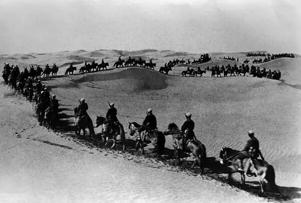 1943年,陕甘宁边区警备第三旅的骑兵团在沙漠中进行军事演习。徐肖冰/摄。