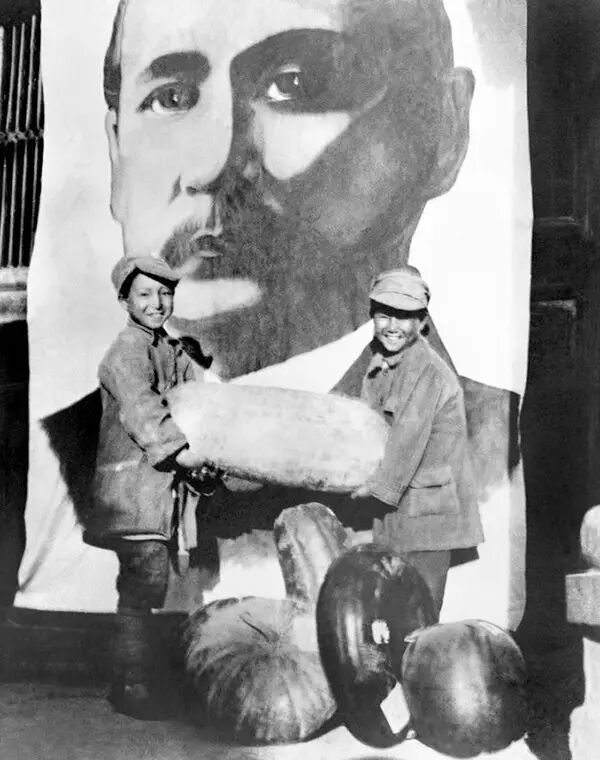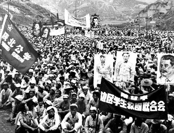 1938年,延安抗大三周年纪念大会,学员们打出的毛泽东、朱德、斯大林的画像。徐肖冰/摄。