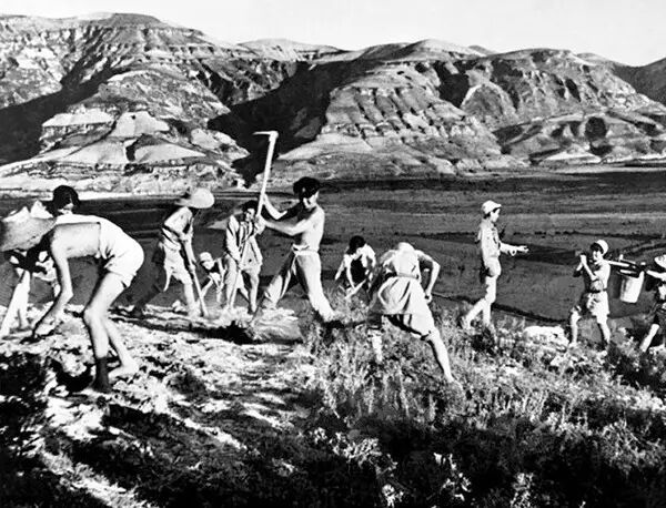 1942年,延安,大生产运动中,八路军在延河边开荒。徐肖冰/摄。