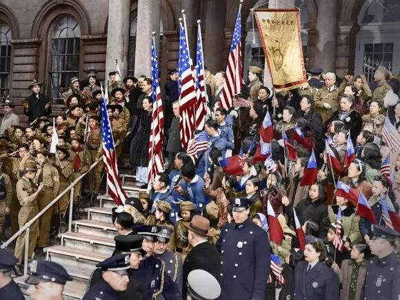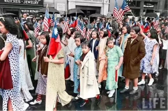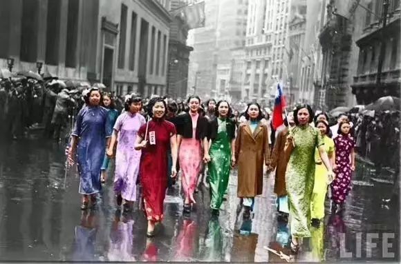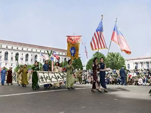 1943年3月25日,旧金山华侨小区的妇女,穿着传统旗袍,举着中美两国国旗,在宋美龄抵达市政厅的时候,举行了欢迎游行仪式。