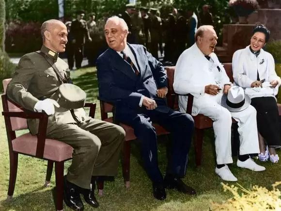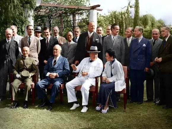 1943年11月25日,中美英三国首脑在开罗会议期间在开罗的米纳饭店外合影。