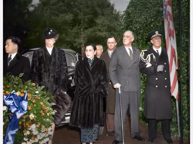 1943年2月22日,在宋美龄以罗斯福总统夫妇的私人朋友身份客居白宫期间,正值美国第一任总统乔治·华盛顿的210年诞辰,宋美龄与罗斯福总统夫妇一行拜偈了华盛顿墓。照片中从左至右分别为孔令侃、罗斯福总统夫人埃莉诺、宋美龄和罗斯福总统。
