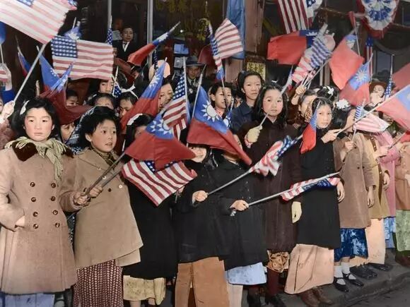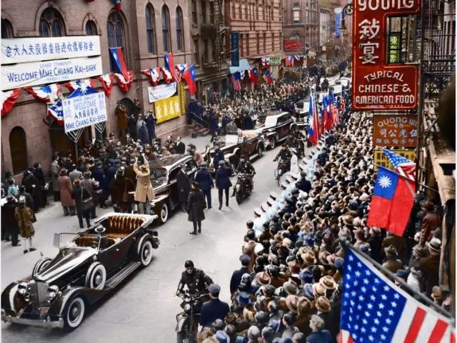 1943年3月,在车队经过的纽约唐人街道路两旁,华人少年挥舞着中美国旗欢迎宋美龄的到来。