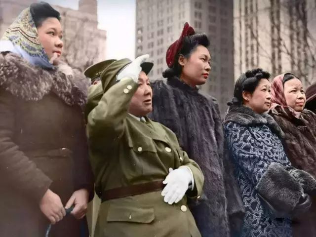 1943年3月,宋美龄结束与中国慈善协会的会议后走出纽约卡内基音乐厅,等候在路边的华人不顾大雪和严寒向宋美龄挥帽致敬。