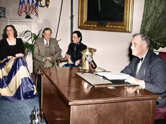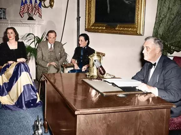 1943年2月22日,宋美龄坐在一旁,美国总统罗斯福在白宫向全美人民发表讲话纪念美国第一任总统乔治·华盛顿210年诞辰。坐在罗斯福桌旁从左至右分别为:玛拉·迪·佐普拉,她是罗斯福总统的一位亲戚;哈瑞·霍普金斯,他是罗斯福亲密的朋友和顾问,宋美龄访美也是由其一手促成。