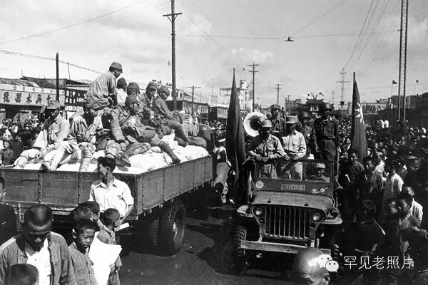 1945年9月5日,美军空运大队开始空运国军新六军接管南京防务。图为1945年9月11日,进入南京市区的国军新六军与两辆日军卡车相对而过。