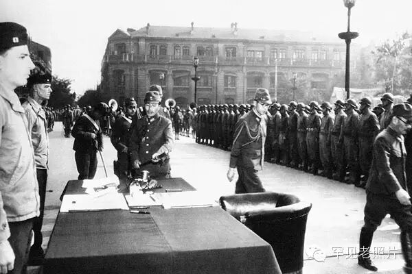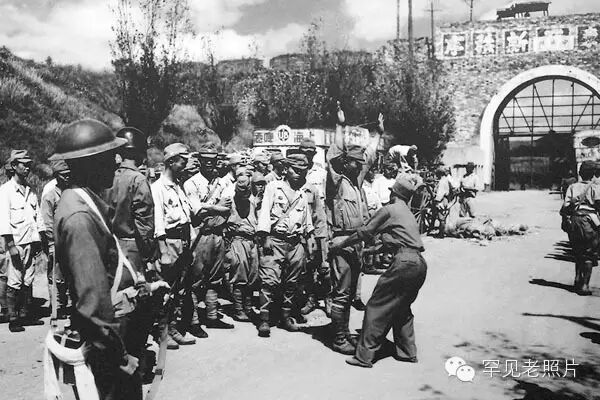 图为1945年10月,安徽芜湖,投降后的日军步出城门前往集中营时,接受中国军官点验部队。