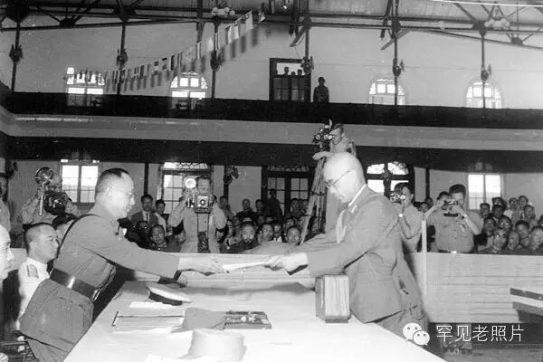 1945年9月9日,日军总参谋长小林漫三郎向中国陆军总司令何应钦呈递降书。