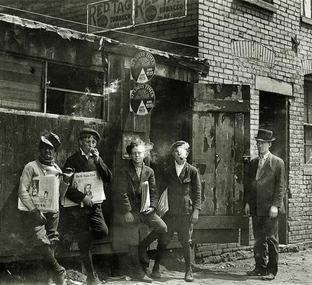 1910年,抽烟的报童。路易斯·海因/摄。