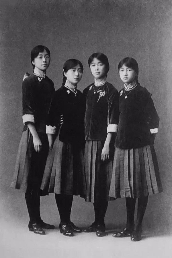 1916年,12岁的林徽因(右一)与表姐妹们身穿北京培华女子中学的校服合影。