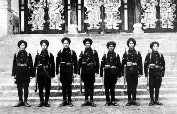 1911年,北京,脚穿中式布靴、手执龙旗的新军军官与士兵。