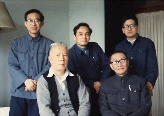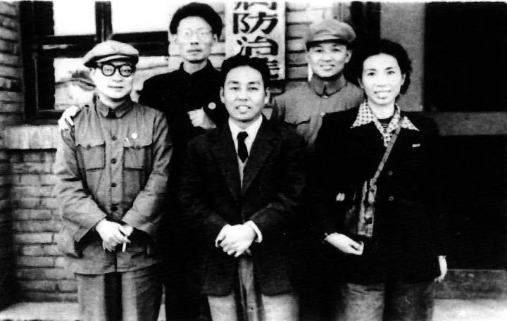 左起:顾骧、周扬、王若水、王元化、周扬秘书小丁。他们参与周扬的人道主义异化文章写作。