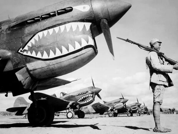 1942年,中国军人守卫来华助战的美国飞虎队 P-40 飞机。
