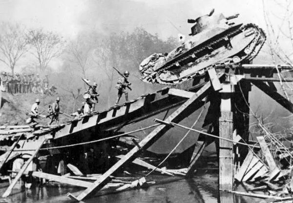 中国战场,日本89式坦克爬桥过河。照片大约拍摄于1938年左右。