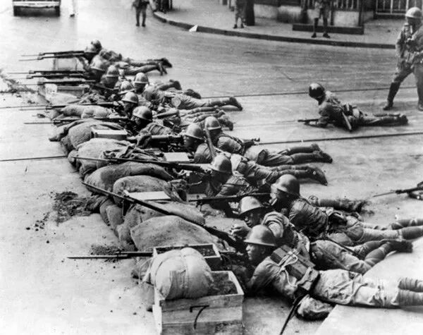 1937年,在中国城市大街上日本士兵用沙袋做掩体。