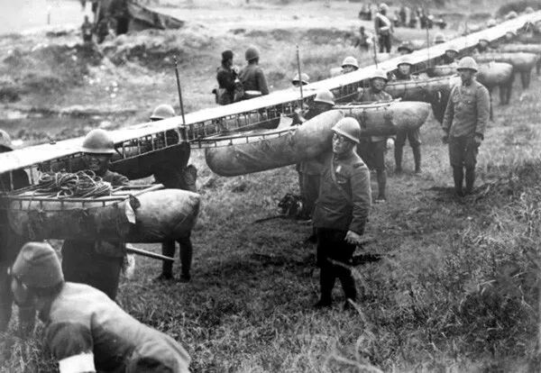 1939年,中国江西省,日本工兵准备在河上架设人行桥。